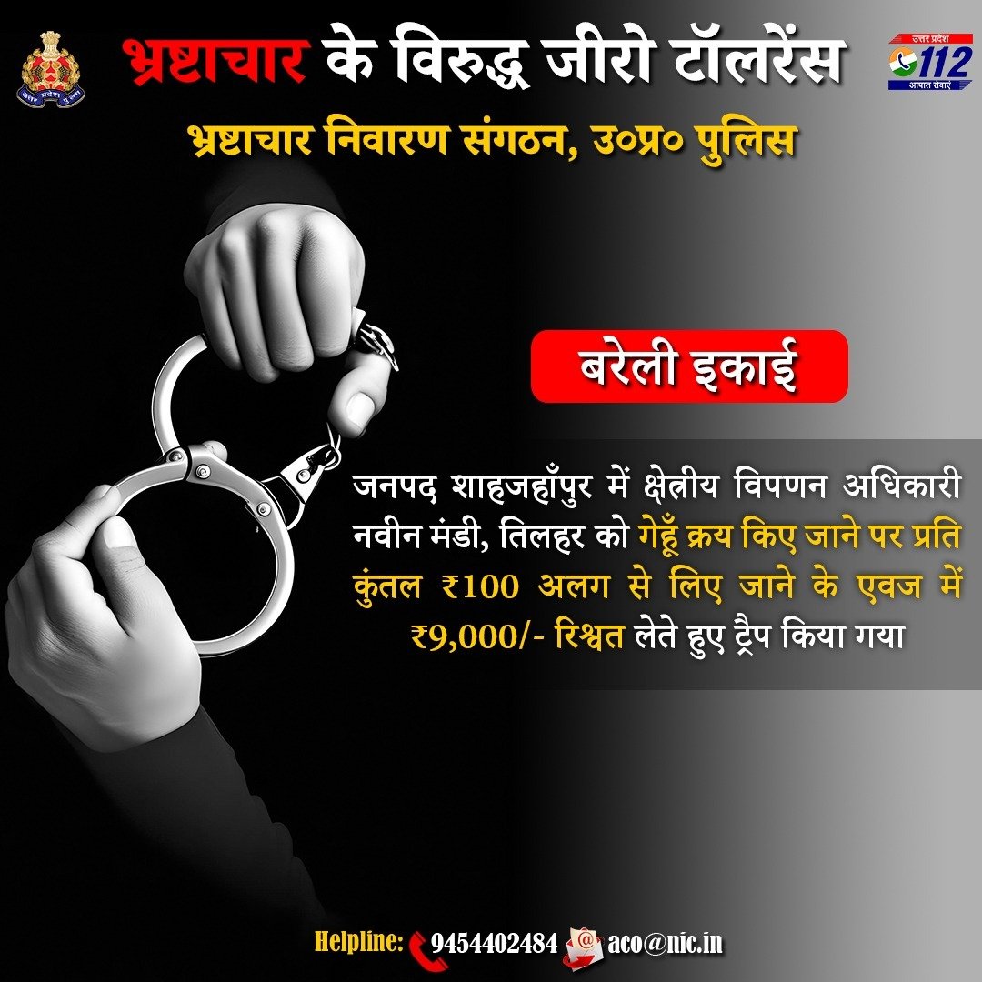 рд╢рд╛рд╣рдЬрд╣рд╛рдБрдкреБрд░ред рднреНрд░рд╖реНрдЯрд╛рдЪрд╛рд░ рдореБрдХреНрдд рд╡реНрдпрд╡рд╕реНрдерд╛ рдХреА рджрд┐рд╢рд╛ рдореЗрдВ рдПрдХ рдмрдбрд╝реА рдХрд╛рд░реНрд░рд╡рд╛рдИ рдХрд░рддреЗ рд╣реБрдП рдмрд░реЗрд▓реА рдЗрдХрд╛рдИ рдиреЗ рдЬрдирдкрдж рд╢рд╛рд╣рдЬрд╣рд╛рдБрдкреБрд░ рдореЗрдВ рдХреНрд╖реЗрддреНрд░реАрдп рд╡рд┐рдкрдгрди рдЕрдзрд┐рдХрд╛рд░реА рдХреЛ рд░рд┐рд╢реНрд╡рдд рд▓реЗрддреЗ рд╣реБрдП рд░рдВрдЧреЗ рд╣рд╛рдереЛрдВ рдЯреНрд░реИрдк рдХрд┐рдпрд╛ рд╣реИред